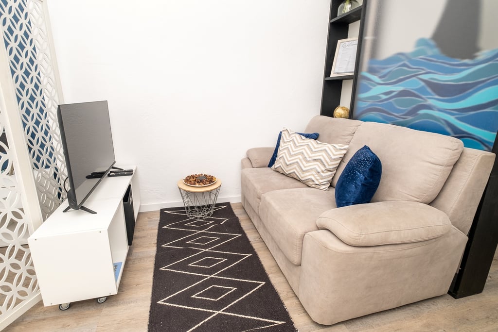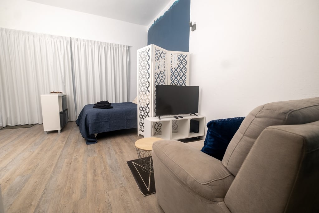 Comfortable, light-filled, and thoughtfully equipped, studio (25 m²) offers sleeping for 2 guests. The studio has a queen bed, linens, blackout blinds, and an en-suite shower — stocked with shampoo, shower gel, and a hairdryer — ensure restful nights. Fresh towels are provided, with mid-stay changes available upon request (every 5 days).